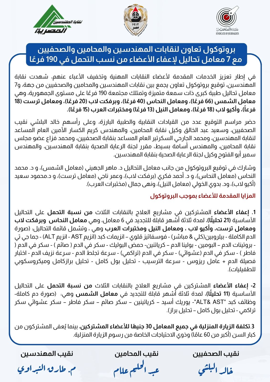 في إطار تعزيز الخدمات المقدمة لأعضاء النقابات المهنية وتخفيف الأعباء عنهم، شهدت نقابة المهندسين، توقيع بروتوكول تعاون يجمع بين نقابات المهندسين والمحامين والصحفيين من جهة، و7 معامل تحاليل طبية كبرى ذات سمعة متميزة وتمتلك مجتمعة 190 فرعًا على مستوى الجمهورية، وهي معامل الشمس (66 فرعًا)، ومعامل النحاس (40 فرعًا)، وبرفكت لاب (20 فرعًا)، ومعامل ترست (18 فرعاً)، وأكيو لاب (18 فرعًا)، ومعامل النيل (13 فرعًا) ومختبرات العرب (15 فرعًا).