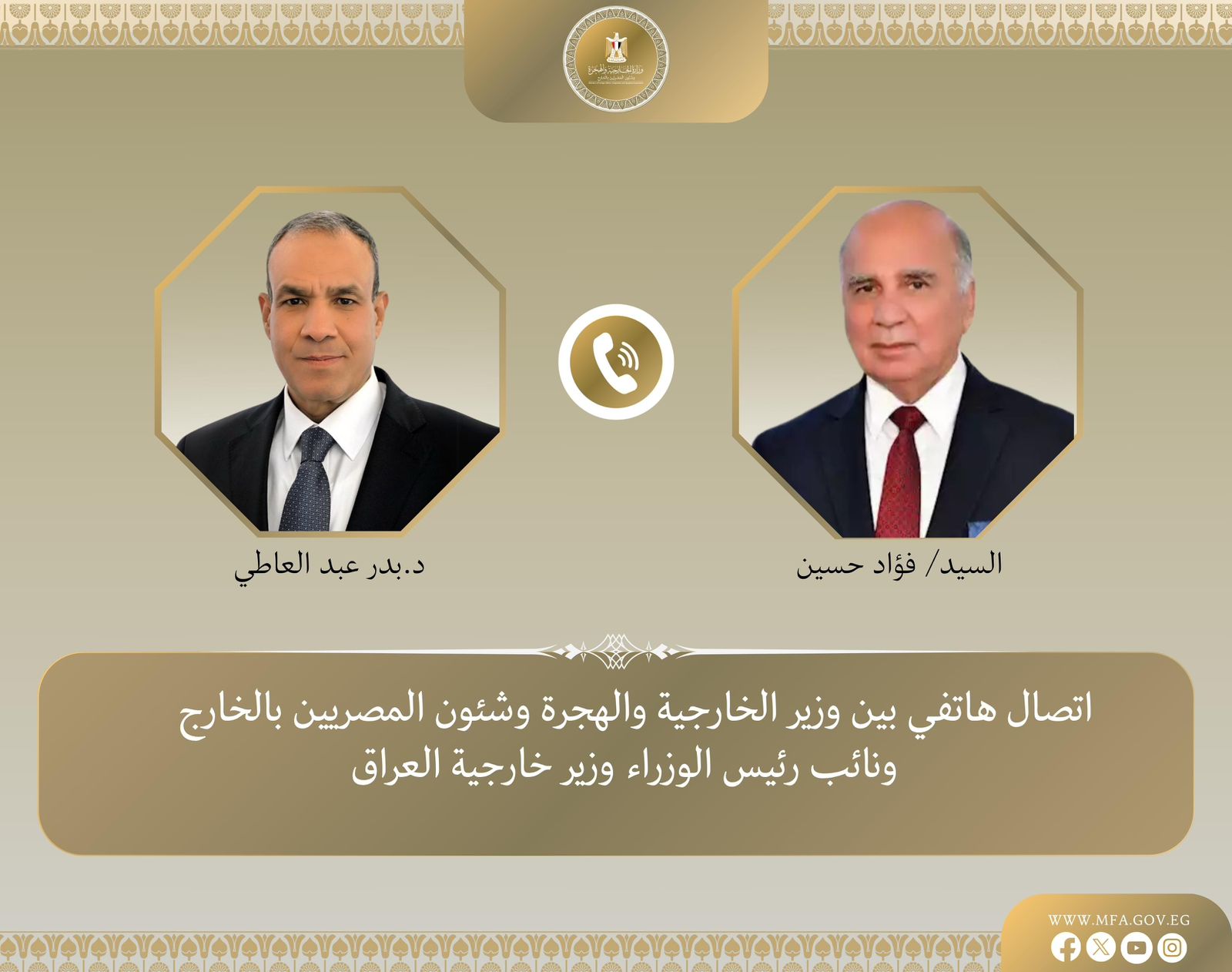 أكد وزير الخارجية والهجرة، بدر عبدالعاطي، خلال اتصال هاتفي من نائب رئيس الوزراء، وزير خارجية العراق، فؤاد حسين، اليوم، الموقف المصري الداعم لأمن واستقرار العراق الشقيق، وترحيب القاهرة بما شهدته السنوات الماضية من تطور في العلاقات المصرية -العراقية.