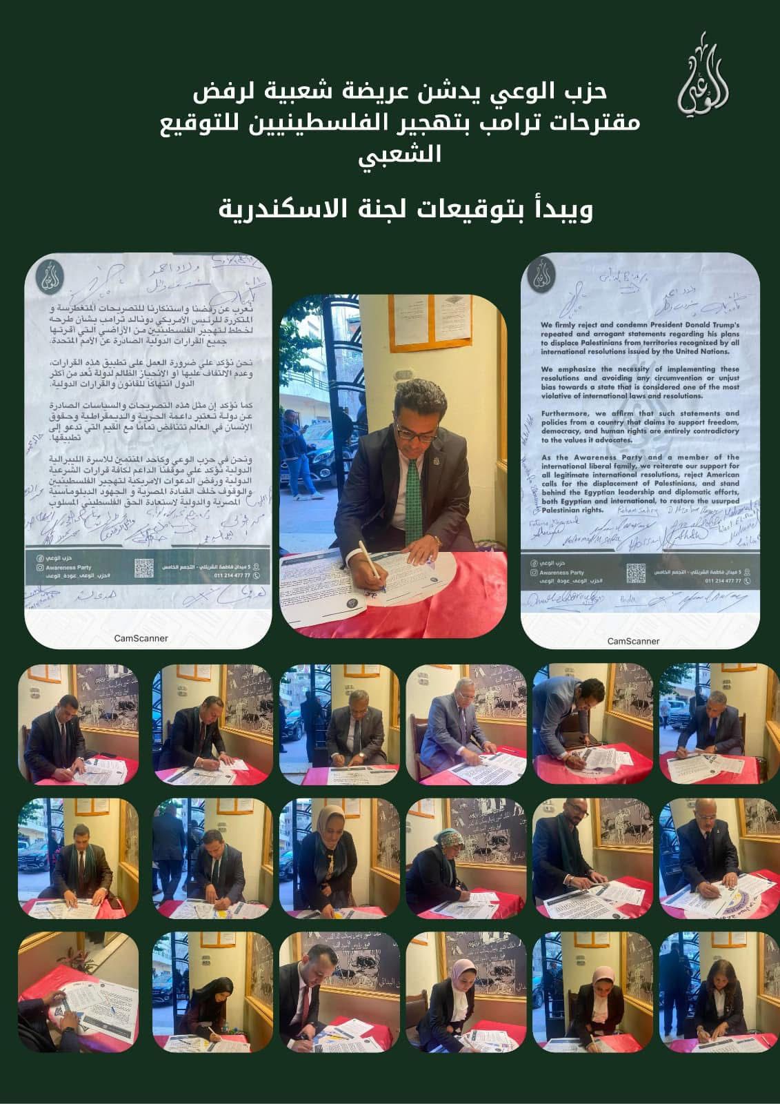 أطلق حزب الوعي عريضة شعبية لجمع التوقيعات الرافضة لمقترحات الرئيس الأمريكي دونالد ترامب بشأن تهجير الفلسطينيين من أراضيهم التاريخية. بدأت الحملة بتوقيعات من لجنة الحزب في الإسكندرية، حيث قام وفد من الحزب برئاسة الدكتور باسل عادل، رئيس الحزب، وعدد من أعضاء اللجنة التأسيسية، بزيارة إلى الإسكندرية ولقاء عدد من القيادات المحلية.