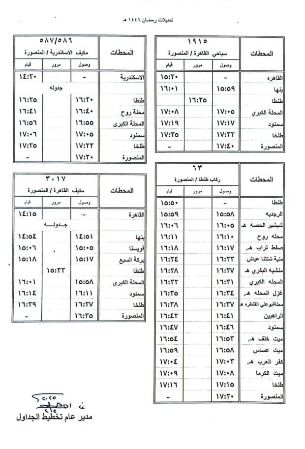 تعديل جداول قطاري 587/586 مكيف الإسكندرية/المنصورة وقطار 63 ركاب طنطا/المنصورة تبعًا لهذه التعديلات.
