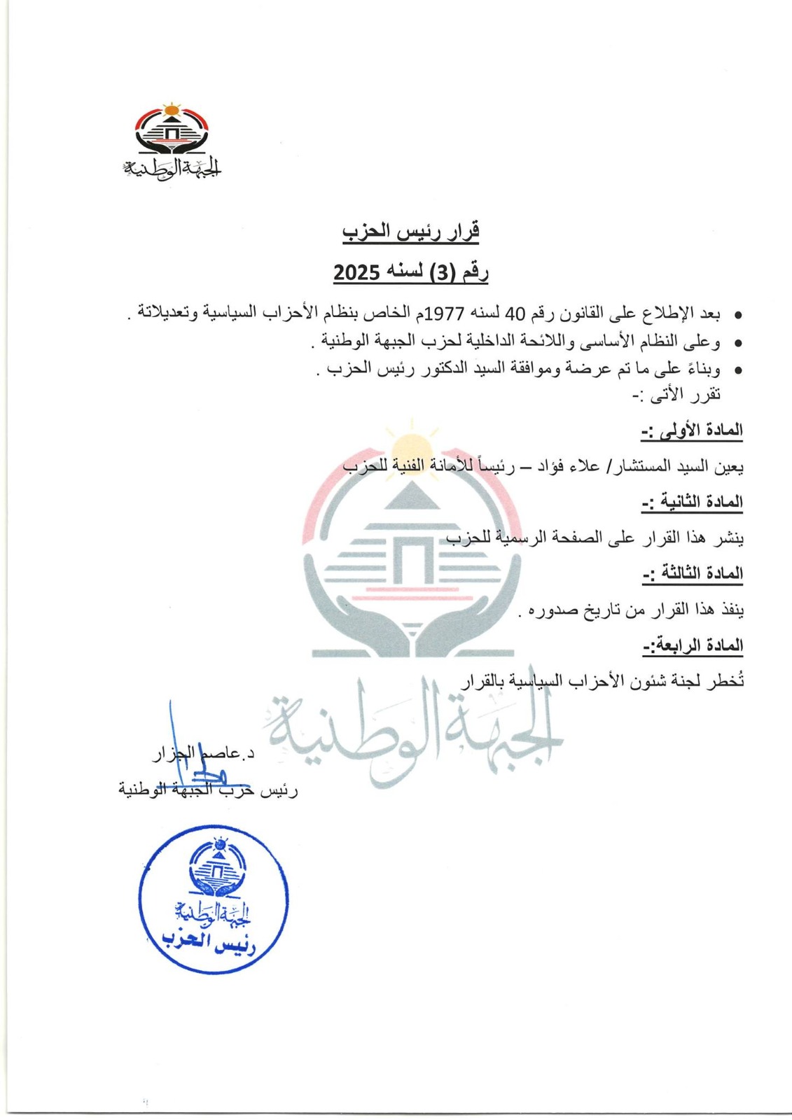 أعلن الدكتور عاصم الجزار رئيس حزب الجبهة الوطنية اختيار المستشار علاء فؤاد رئيسا للأمانة الفنية للحزب واختيار أحمد رسلان أمينا للتنظيم المركزي وأحمد فؤاد أباظة نائبا للأمين العام للحزب.