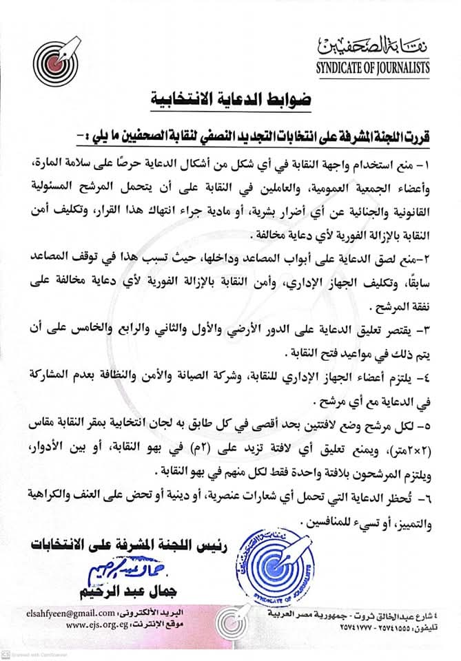 1- منع استخدام واجهة النقابة في أي شكل من أشكال الدعاية حرصًا على سلامة المارة، وأعضاء الجمعية العمومية، والعاملين في النقابة على أن يتحمل المرشح المسئولية القانونية والجنائية عن أي أضرار بشرية، أو مادية جراء انتهاك هذا القرار، وتكليف أمن النقابة بالإزالة الفورية لأي دعاية مخالفة.