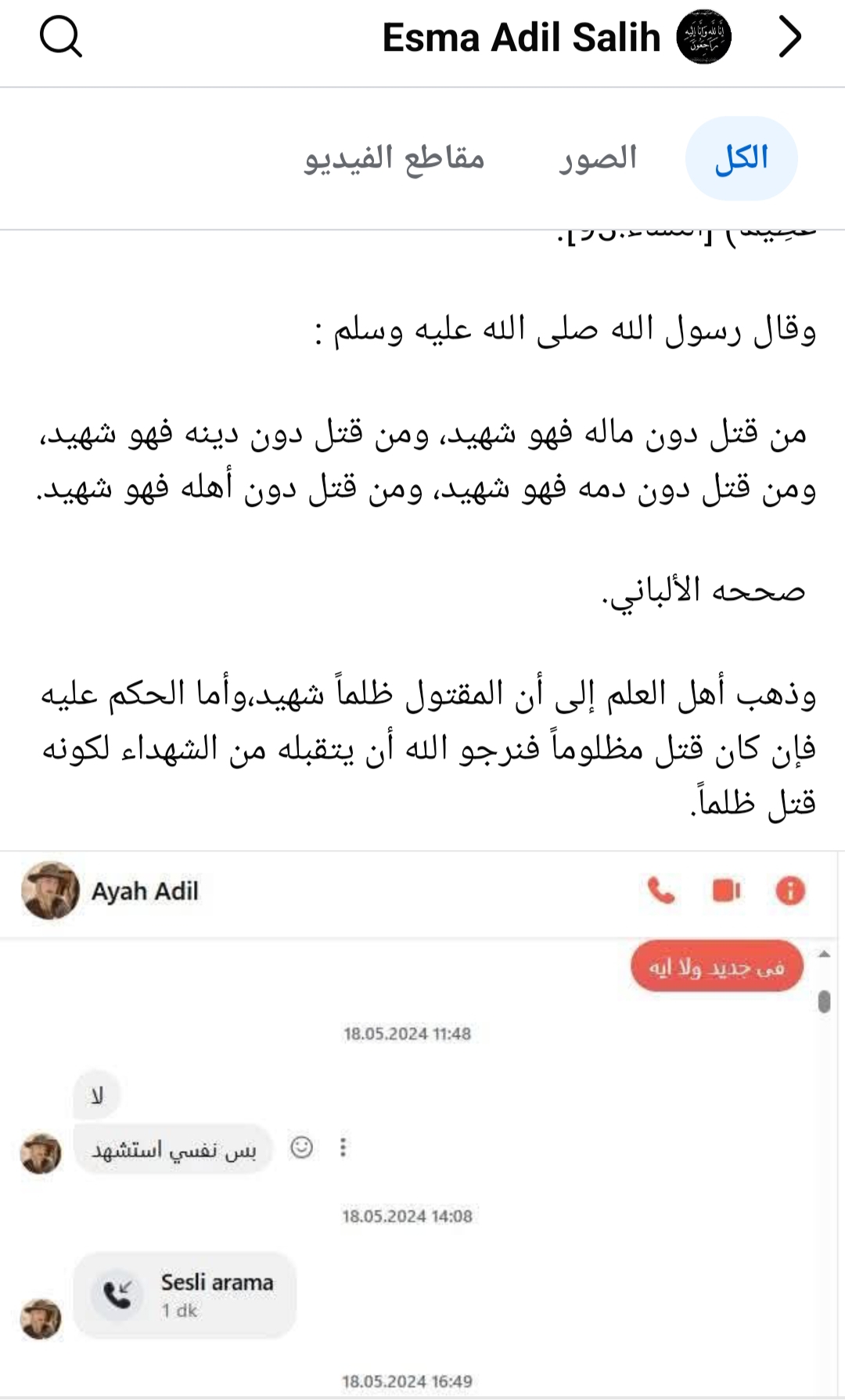 ونشرت شقيقة الراحلة الساعات الماضية منشور يحتوى على « شات» محادثة كانت بينها وبين اختها قبل وفاتها، كتبت تقول :”من قتل دون ماله فهو شهيد، ومن قتل دون دينه فهو شهيد، ومن قتل دون دمه فهو شهيد، ومن قتل دون أهله فهو شهيد”، كما وطالبت بأخذ حق اختها المتوفية قائلة:”عاوزين حق اختى اليتيمة يارب ملناش غيرك يارب”