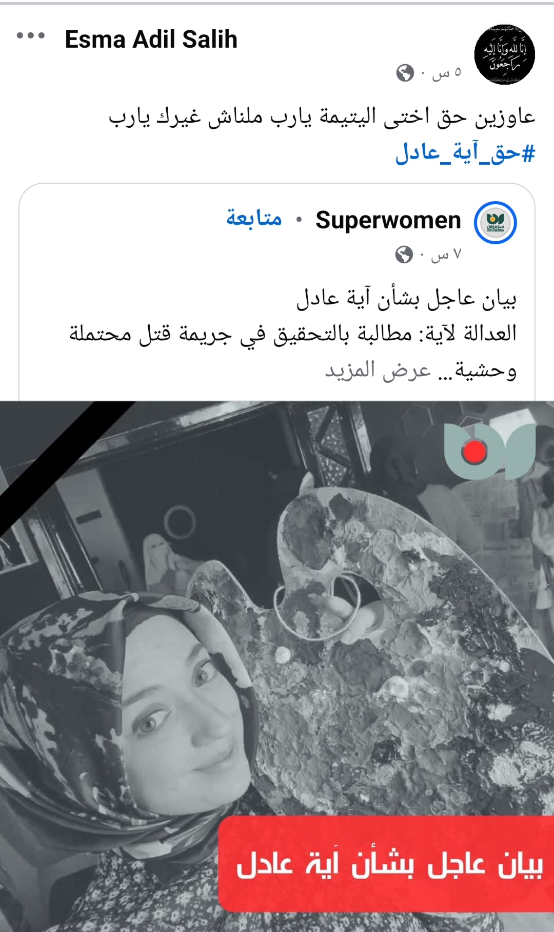 قام زوجها بكتابة منشور على موقع التواصل الإجتماعي فيسبوك، أعلن فيه وفاة زوجته، آية عادل، مشيرًا إلى أنها لقيت مصرعها إثر حادث مروع واختلال في التوازن مما أدي لسقوطها من شرفة منزلهم.