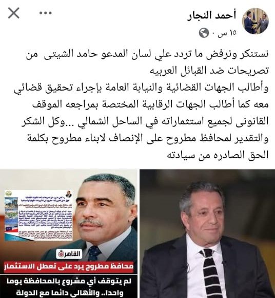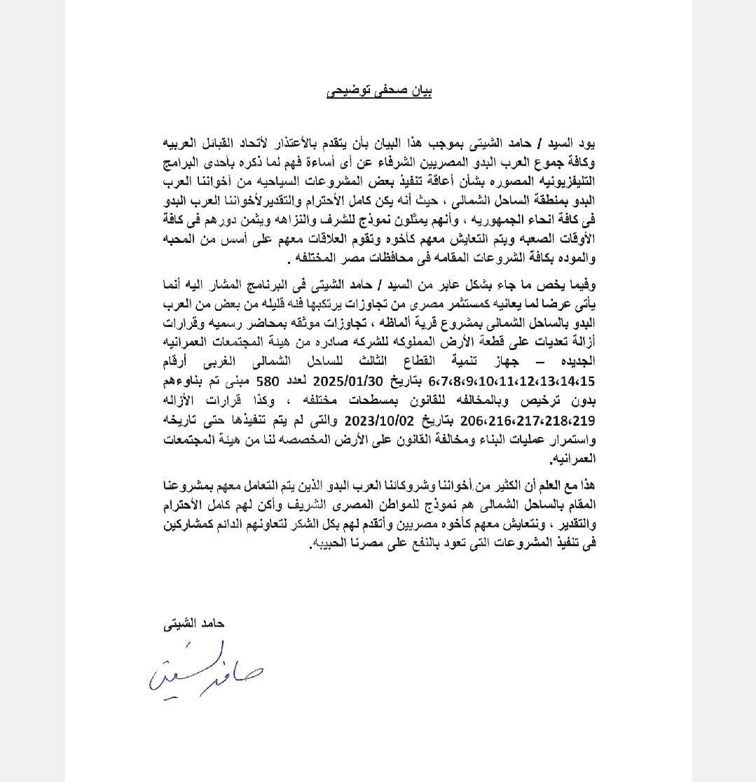 ومؤخرًا أصدر رجل الأعمال المصري حامد الشيتي مؤخرًا بيانًا رسميًا يوضح فيه ملابسات تصريحاته الأخيرة التي أثارت جدلاً واسعًا بين أبناء القبائل العربية البدوية في محافظة مطروح، مؤكدًا اعتذاره الصريح لاتحاد القبائل العربية وكافة البدو المصريين عن أي سوء فهم قد يكون نجم عن تصريحاته خلال ظهوره التلفزيوني الأخير.