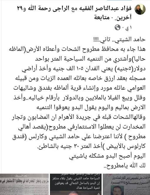 وأبدى فؤاد عبد الناصر الفقيه استياءه من تصرفات حامد الشيتي، مشيرًا إلى حصوله على أراضٍ في مطروح بأسعار زهيدة من خلال تعاملات مع محافظ مطروح السابق، حيث حصل على الأرض من هيئة التنمية السياحية بسعر دولار واحد للمتر (ما يعادل 5 جنيهات).