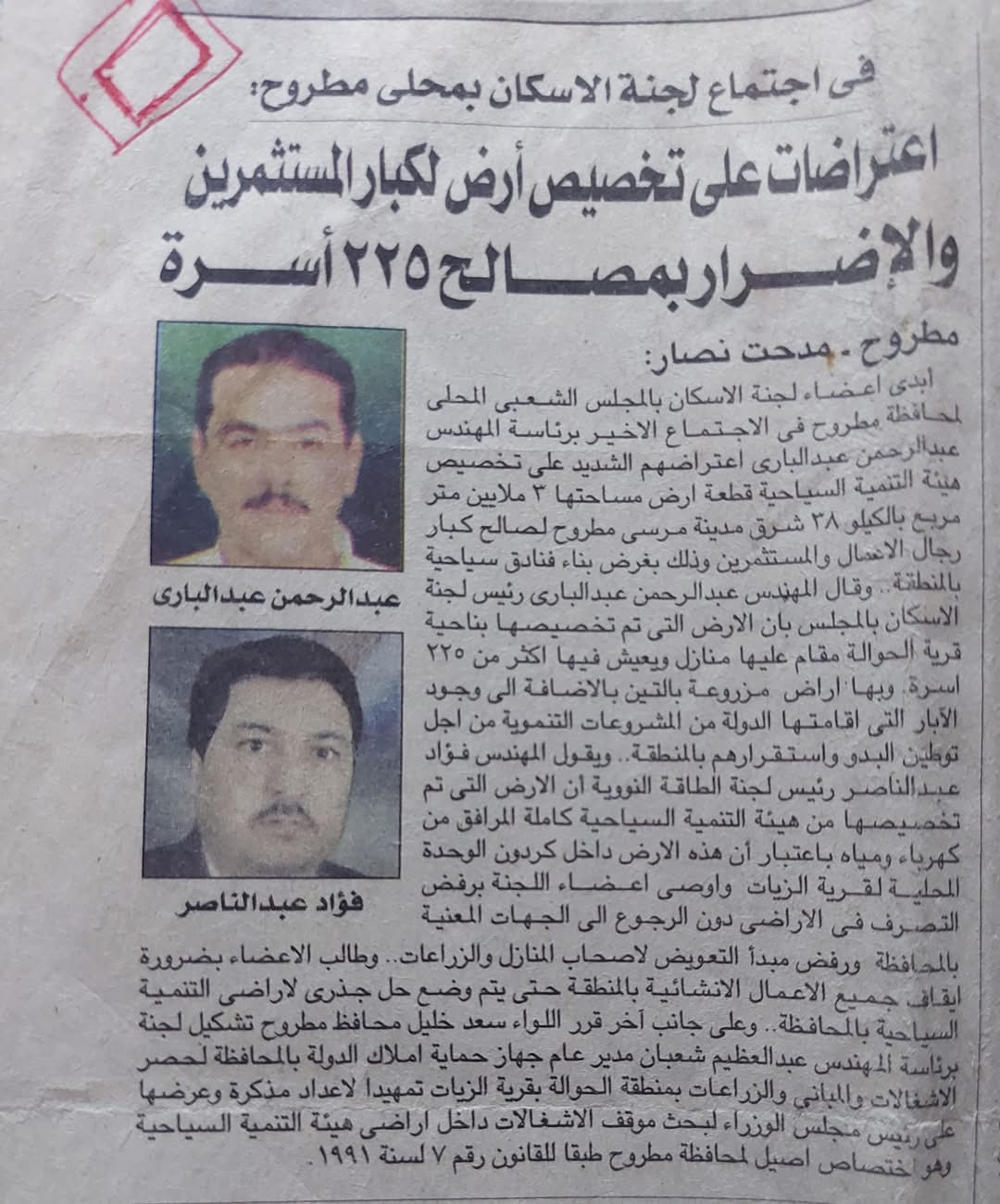 وأشار إلى أن استثمارات الشيتي قامت بحماية أهالي مطروح الذين وفروا الأمان لقريته السياحية، مؤكدًا أن قضايا الأراضي ما زالت محل نزاع قانوني.