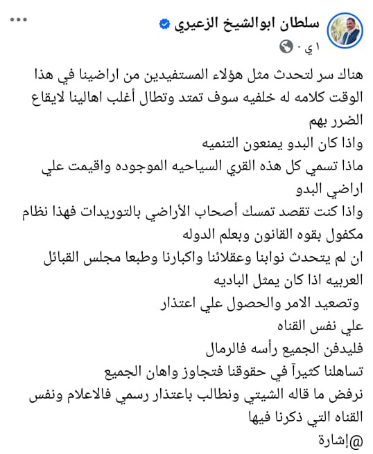 تصريحات الشيتي، التي وصفت بأنها تحمل طابعًا “عنصريًا” تجاه البدو، أثارت استياءً واسعًا بين شيوخ القبائل والنشطاء المحليين الذين اعتبروا حديثه انتقاصًا من دورهم التاريخي في حماية الأرض ودعم استقرار البلاد.