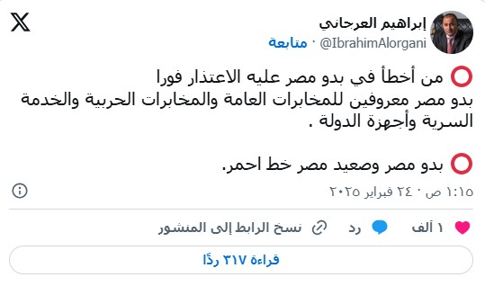 وكتب في منشور آخر على صفحته: “بدو مصر وصعيد مصر خط أحمر”