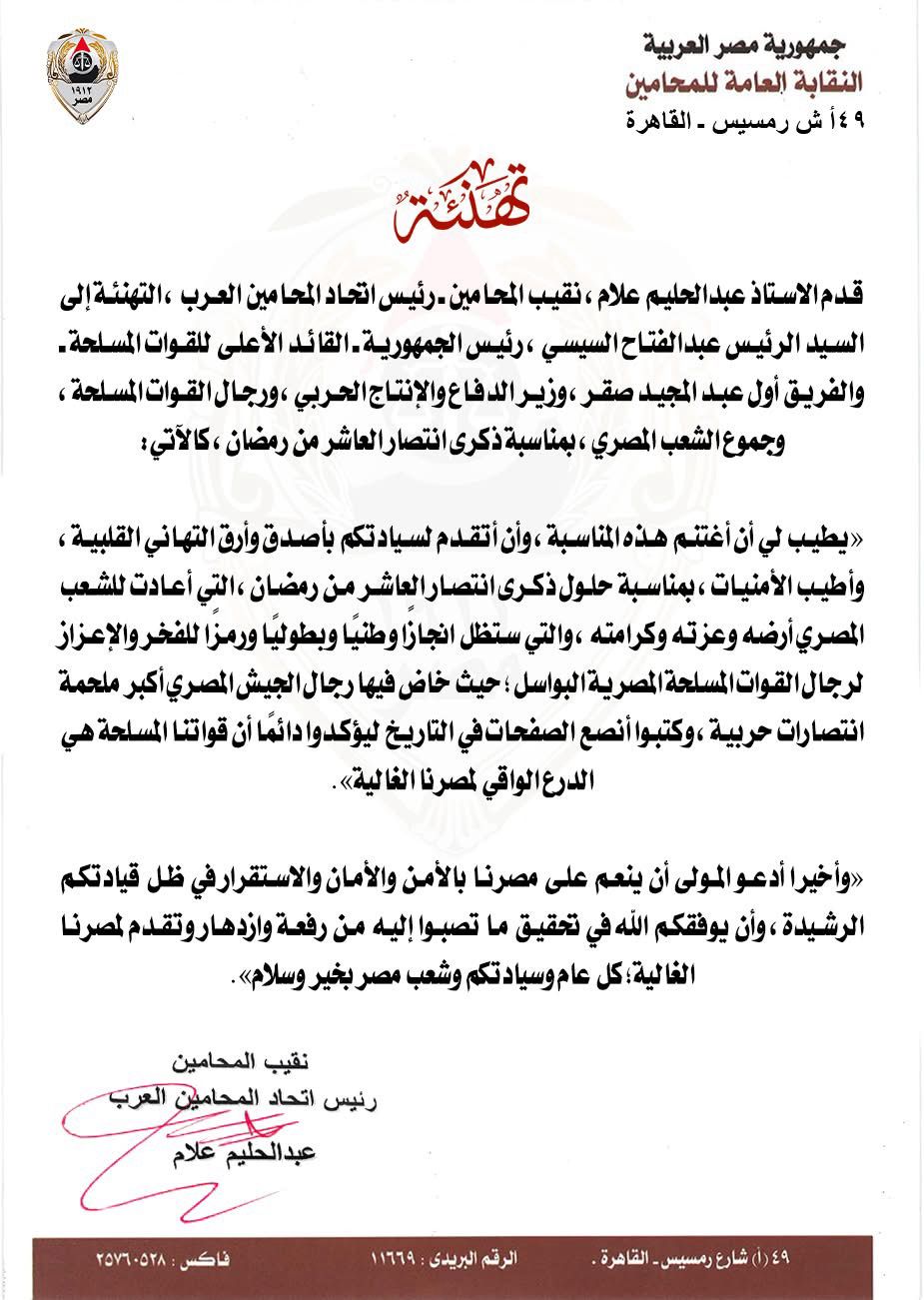 قدم الاستاذ عبدالحليم علام، نقيب المحامين ـ رئيس اتحاد المحامين العرب ، التهنئة إلى السيد الرئيس عبدالفتاح السيسي، رئيس الجمهورية ـ القائد الأعلى للقوات المسلحة ـ والفريق أول عبد المجيد صقر، وزير الدفاع والإنتاج الحربي، ورجال القوات المسلحة، وجموع الشعب المصري، بمناسبة ذكرى انتصار العاشر من رمضان، كالآتي: