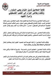 وتؤكد نقابة المحامين، أن تلك الجريمة تعد تصعيداً خطيراً ينذر بمخاطر إشعال المواجهة في المنطقة بشكل يؤدي إلى عواقب وخيمة.