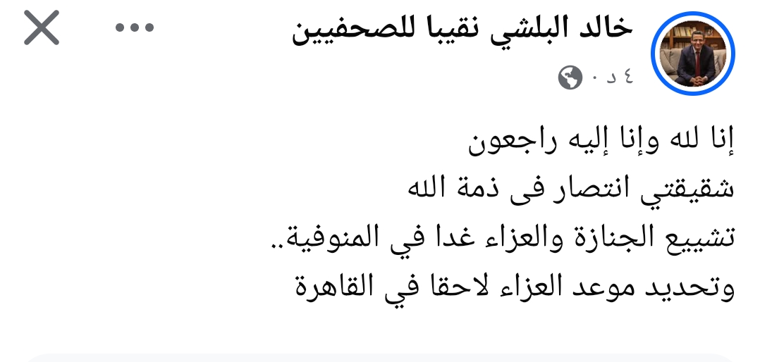 وكتب البلشي على صفحته الشخصية، على موقع التواصل الاجتماعي، فيس بوك قائلا: ” إنا لله وإنا إليه راجعون، شقيقتي انتصار فى ذمة الله، تشييع الجنازة والعزاء غدا في المنوفية، وتحديد موعد العزاء لاحقا في القاهرة”.