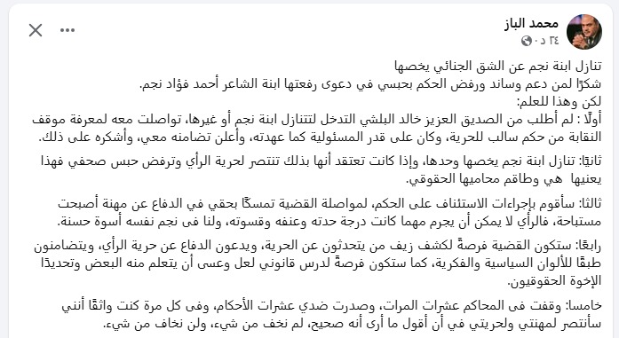 وأكد محمد الباز، في تدوينة نشرها عبر صفحته الرسمية على فيسبوك، أن تنازل الكاتبة الصحفية نوارة أحمد فؤاد نجم عن الدعوى الجنائية يخصها وحدها.