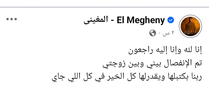 وكتب المغيني قائلاً: إنا لله وإنا إليه راجعون تم الإنفصال بيني وبين زوجتي ربنا بكتبلها ويقدرلها كل الخير في كل اللي جاي.