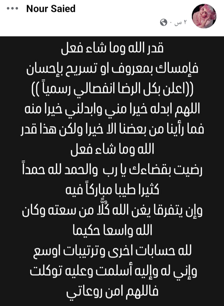 بينما كتبت زوجته نور سعيد عبر حسابها فيسبوك قائلة: قدر الله وماشاء فعل فإمساك بمعروف أو تسريح بإحسان، أعلن بكل رضا انفصالي رسمياً، اللهم أبدله خيرا مني وابدلني خيراً منه.