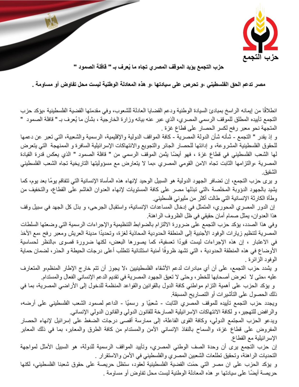 و يؤكد الحزب على ان مصر التي حمَت القضية الفلسطينية لعقود، ستظل حريصة على حقوق شعبنا الفلسطيني، لكنها حريصة أيضًا على سيادتها ،و هذه المعادلة الوطنية ليست محل تفاوض أو مساومة .