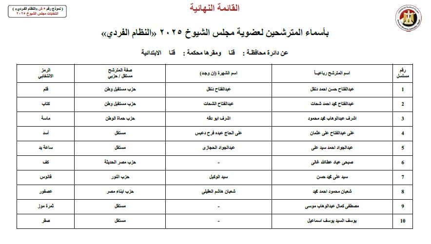 أعلنت الهيئة الوطنية للانتخابات القائمة النهائية لمرشحي انتخابات مجلس الشيوخ 2025 ، لمحافظة (قنا) و بلغ عدد المرشحين بنظام الفردي (24).