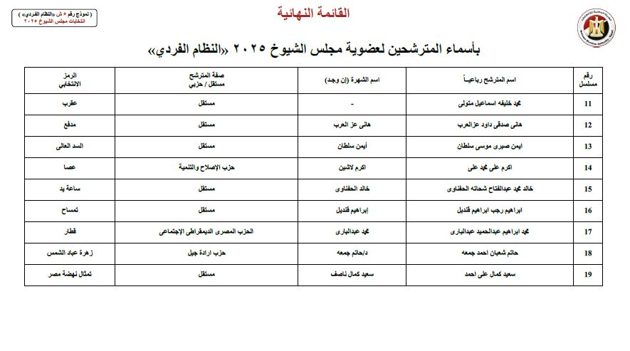 وكان القاضي حازم بدوي رئيس الهيئة الوطنية للانتخابات قد اعلن صباح اليوم الجمعة الموافق 18 من يوليو 2025 عن القائمة النهائية لأسماء المترشحين لانتخابات مجلس الشيوخ 2025 وذلك بعد فصل محكمة القضاء الإداري في الطعون التي قدمت اليها، وبلغ عدد المترشحين على المقاعد الفردية 428 مرشحاً، منهم 186 مرشحاً مستقلاً ، و 242 مرشحاً عن الأحزاب السياسية، وقائمة واحدة في كل من الدوائر المخصصة لنظام القوائم تحت اسم القائمة الوطنية من أجل مصر.