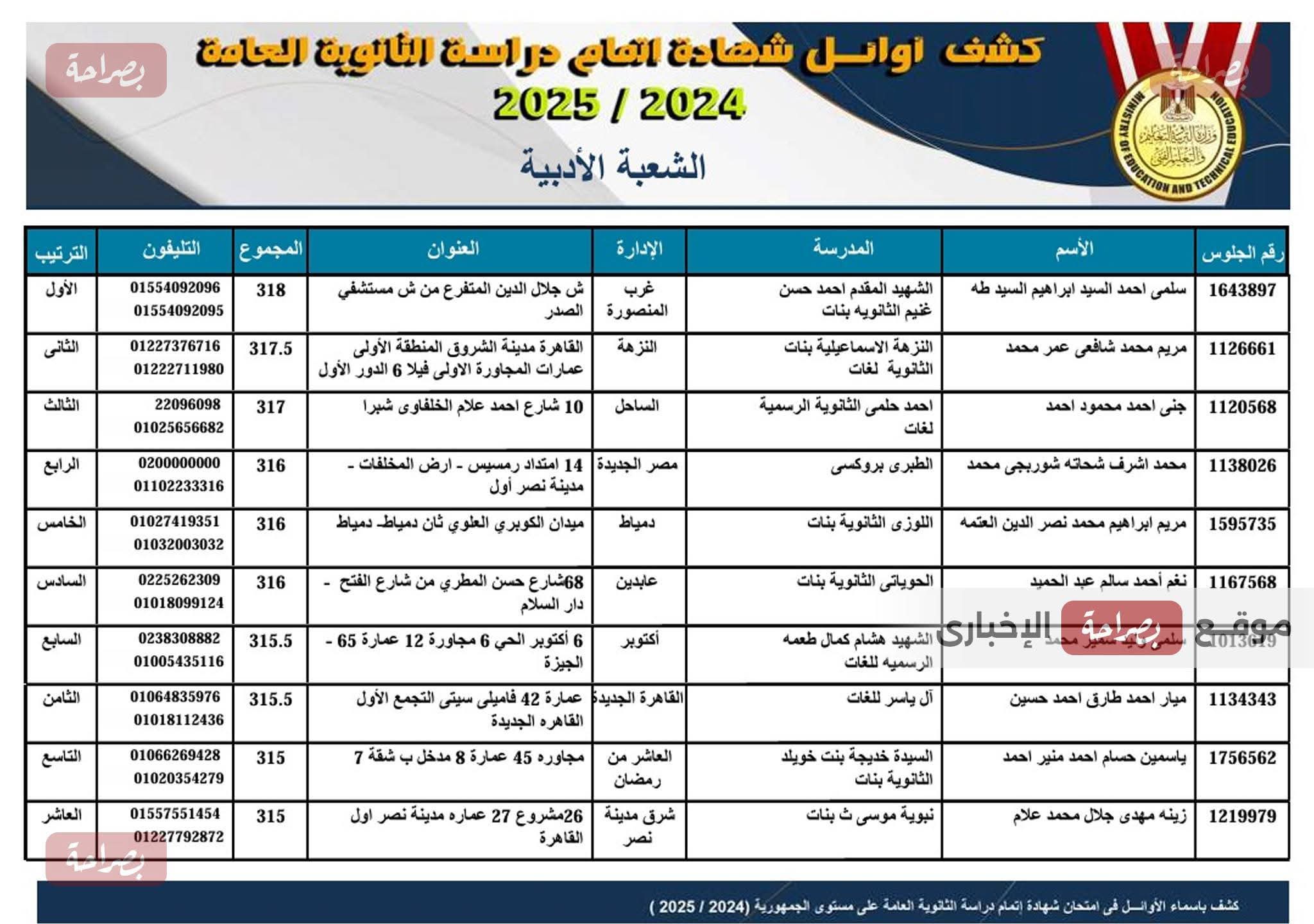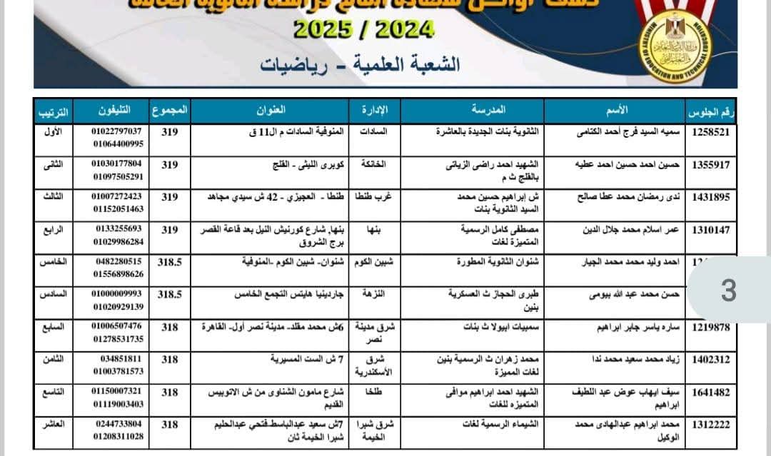 ظهرت منذ قليل الكشوف الخاصة بأوائل الثانوية العامة 2025, عقب إعلان وزير التربية والتعليم والتعليم الفني، اعتماد نتائج الثانوية العامة.