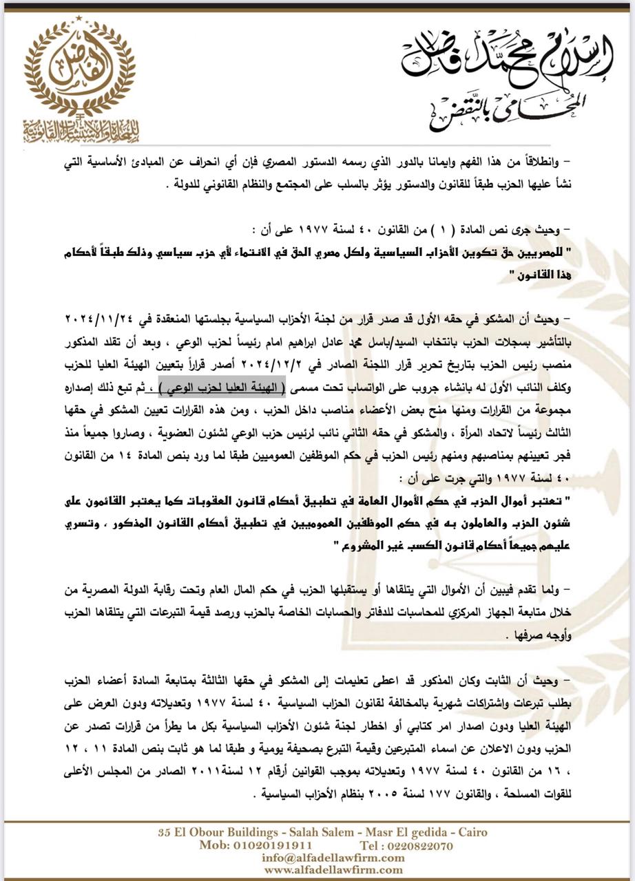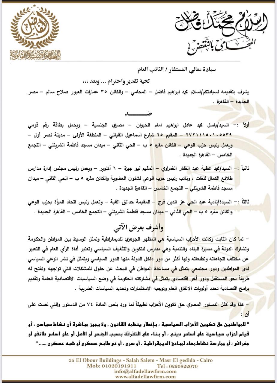 تقدّم كل من السكرتير العام التنفيذي لحزب “الوعي” ونائب رئيس الحزب السابق، ببلاغ رسمي إلى مكتب النائب العام، تم قيده تحت رقم 1309486. كما تقدم السكرتير العام المساعد لقطاع القاهرة الكبرى ببلاغ مماثل، ضد عدد من القيادات العليا في الحزب، وهم: