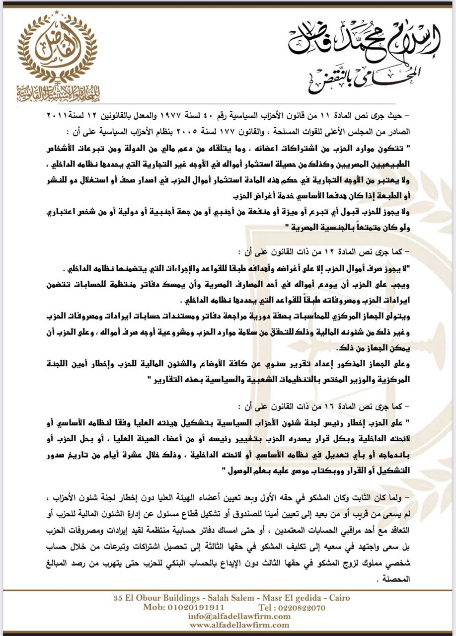 وأكد مقدمو البلاغ أن هذه الأفعال تُعد مخالفة صريحة لأحكام المواد 11 و12 و16 و25 و26 من القانون رقم 40 لسنة 1977 بشأن الأحزاب السياسية وتعديلاته، فضلًا عن مخالفتها لعدد من مواد قانون العقوبات.
