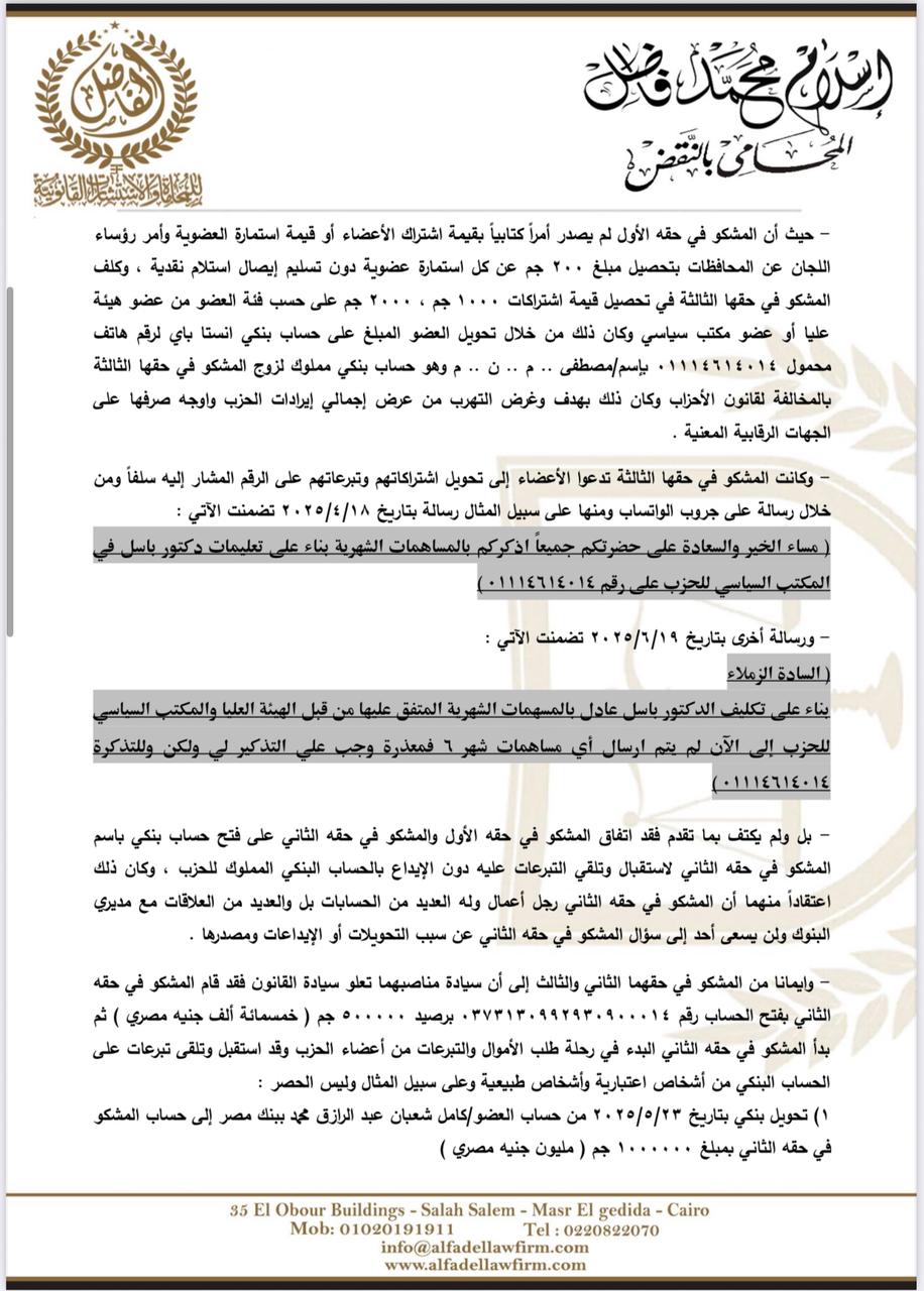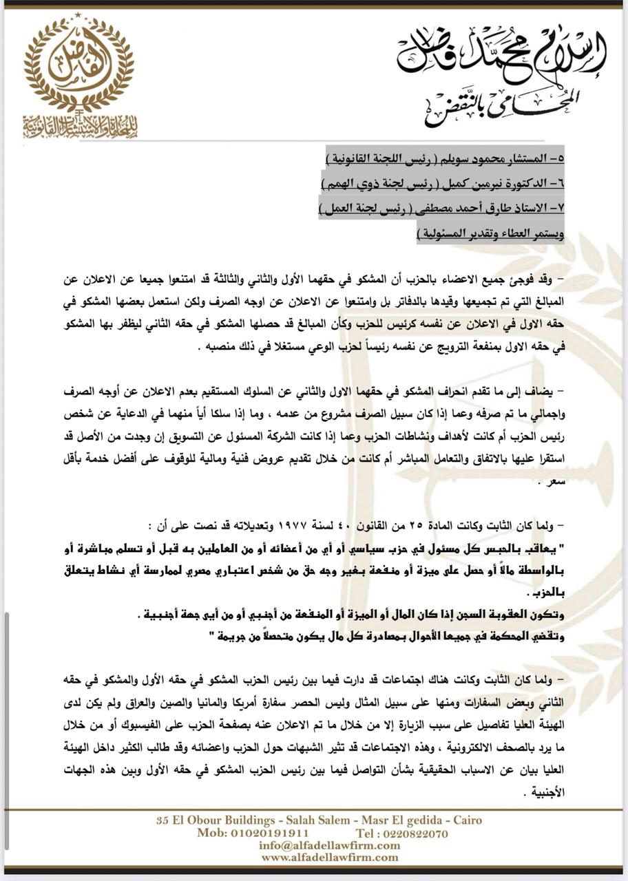 واتهم مقدمو البلاغ قيادة الحزب بارتكاب مخالفات إدارية، شملت عدم إخطار لجنة شؤون الأحزاب بأسماء أعضاء الهيئة العليا، وإصدار قرارات إقصاء انتقائية وغير مبررة بحق عدد من القيادات، من بينهم رئيس شباب الحزب، والسكرتير العام التنفيذي ونائبه، دون إجراء أي تحقيق داخلي أو اتخاذ إجراءات تنظيمية منصوص عليها في اللائحة الداخلية للحزب، وهو ما اعتبروه مخالفًا صريحًا للضوابط الحزبية.