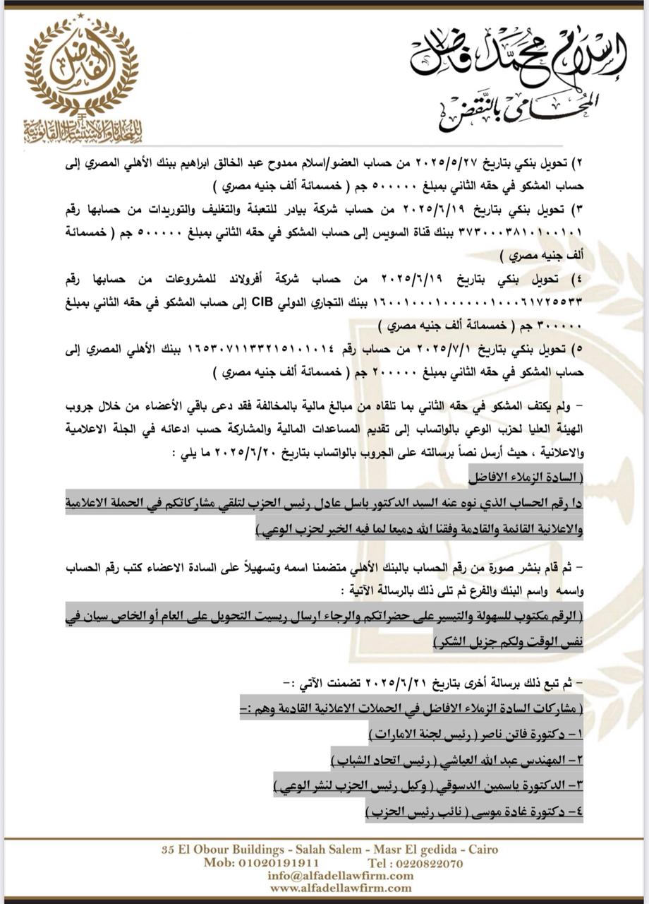 كما أشار البلاغ إلى ما وصفوه بـ “تجاوزات مالية”، تمثلت في إدارة الشؤون المالية للحزب بصورة فردية من قبل رئيس الحزب وبعض القيادات، دون الالتزام بالمعايير القانونية، حيث تم تلقي تبرعات واشتراكات من الأعضاء عبر حسابات شخصية، مع الامتناع عن الإفصاح عن حجم هذه التبرعات أو أوجه إنفاقها، بما يثير الشكوك حول مدى مشروعيتها. وأضاف البلاغ أن من بين التجاوزات، تلقي تبرعات من جهات اعتبارية بالمخالفة لقانون الأحزاب السياسية.