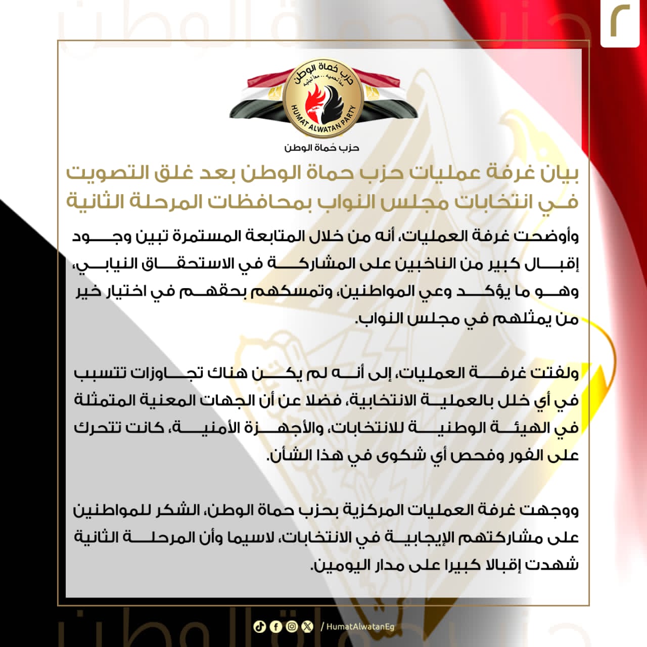 ووجهت غرفة العمليات المركزية بحزب حماة الوطن، الشكر للمواطنين على مشاركتهم الإيجابية في الانتخابات، لاسيما وأن المرحلة الثانية شهدت إقبالا كبيرا على مدار اليومين.