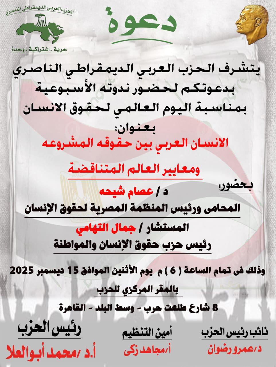 يعقد الحزب العربي الناصري، برئاسة الدكتور محمد أبو العلا، رئيس الحزب وعضو مجلس الشيوخ، ندوته الأسبوعية بمناسبة اليوم العالمي لحقوق الإنسان، تحت عنوان: “الإنسان العربي بين حقوقه المشروعة ومعايير العالم المتناقضة”.