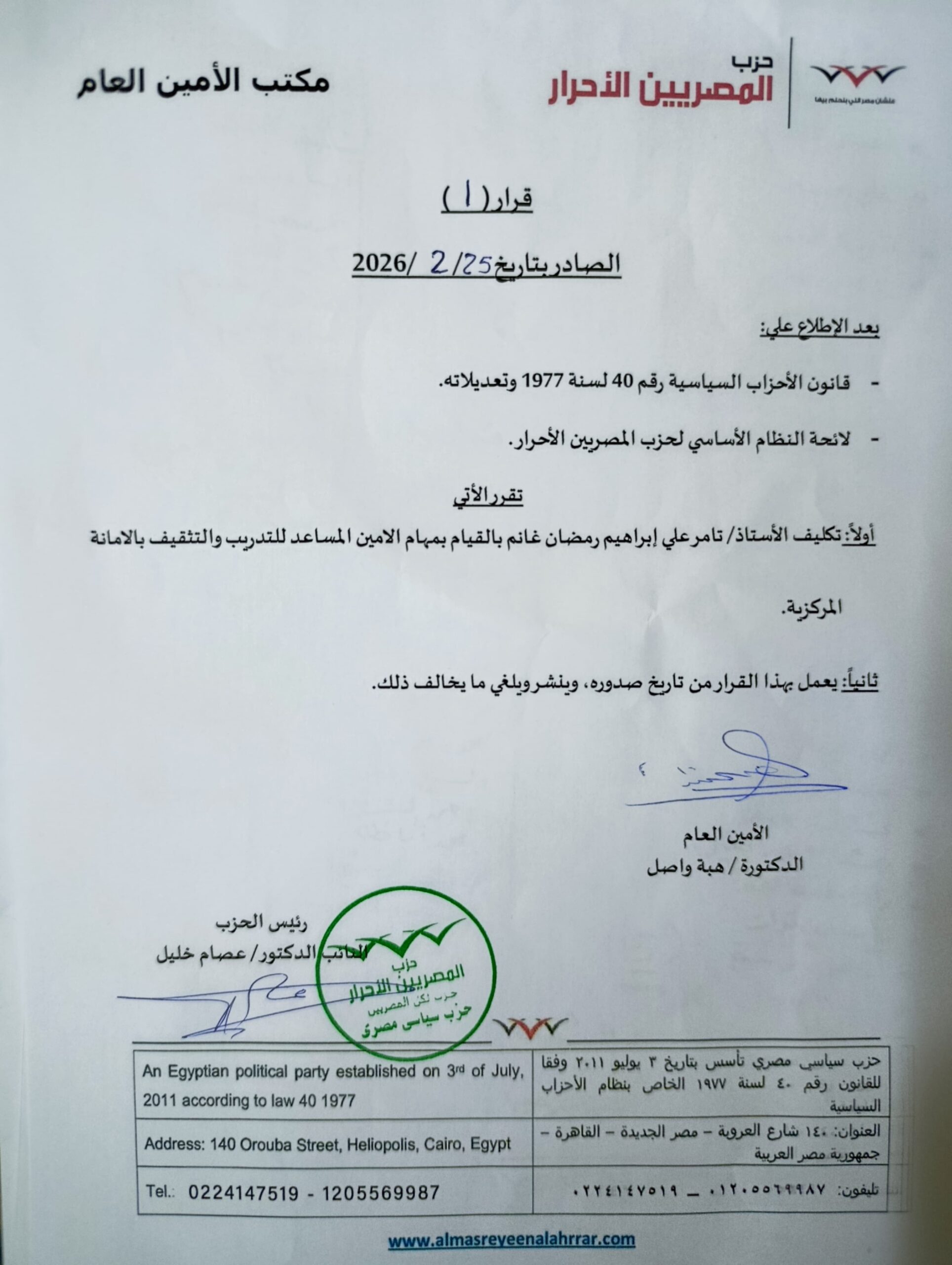 واعتمد القرار النائب الدكتور عصام خليل، رئيس الحزب، بعد الاطلاع على قانون الأحزاب السياسية رقم 40 لسنة 1977 وتعديلاته، ولائحة النظام الأساسي للحزب، حيث تقرر تكليف الدكتور تامر علي إبراهيم رمضان غانم بمهام الأمين المساعد للتدريب والتثقيف، على أن يُعمل بالقرار من تاريخ صدوره، ويُنشر، ويُلغى ما يخالفه من قرارات سابقة.