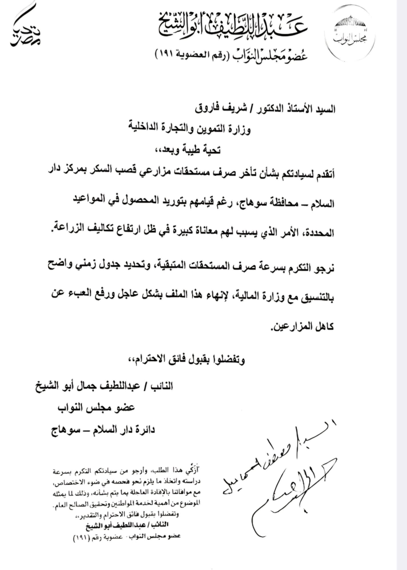 تقدم النائب عبد اللطيف أبو الشيخ، عضو مجلس النواب، بطلب إحاطة إلى الحكومة بشأن تأخر صرف مستحقات مزارعي قصب السكر بمركز دار السلام بمحافظة سوهاج، رغم قيامهم بتوريد المحصول في المواعيد المحددة.