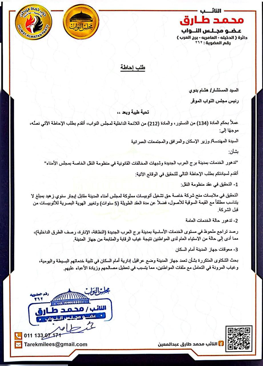تقدم النائب محمد طارق ، عضو مجلس النواب عن محافظة الإسكندرية ، بطلب إحاطة لوزير الإسكان ، بشأن تدهور الخدمات بمدينة برج العرب الجديدة وشبهات المخالفات القانونية في منظومة النقل الخاصة بمجلس الأمناء”