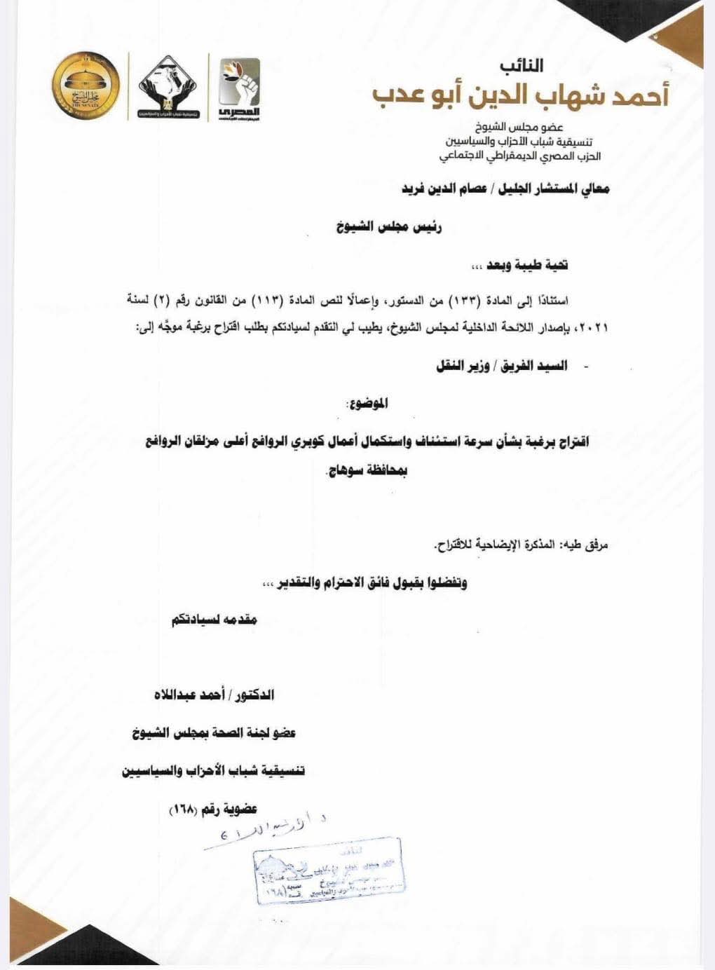 تقدم النائب أحمد عبد اللاه عضو مجلس الشيوخ عن الحزب المصري الديمقراطي الاجتماعي باقتراح برغبة إلى المستشار عصام فريد، رئيس مجلس الشيوخ، موجه إلى وزير النقل، بشأن سرعة استئناف واستكمال أعمال كوبري الروافع أعلى مزلقان الروافع بمحافظة سوهاج