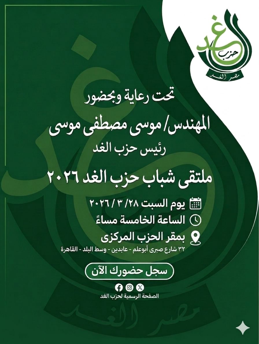 ينظم حزب الغد ملتقى لشباب الحزب يوم السبت الموافق 28 مارس 2026، وذلك بالمقر المركزي للحزب الكائن في 32 شارع صبري أبو علم، المتفرع من ميدان طلعت حرب بوسط القاهرة، تحت رعاية رئيس الحزب المهندس موسى مصطفى موسى.