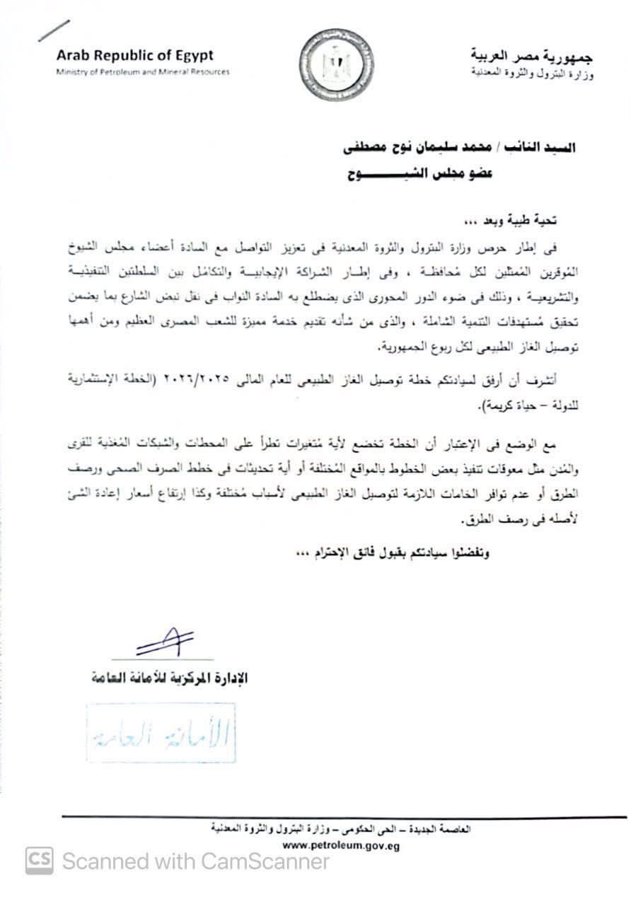 تلقى النائب المهندس محمد نوح، عضو مجلس الشيوخ وعضو لجنة الإسكان بالمجلس، وأمين التنظيم بحزب حماة الوطن بمحافظة الشرقية، ردًا من وزارة البترول والثروة المعدنية بشأن خطة توصيل الغاز الطبيعي للعام المالي 2025/2026، وذلك في إطار جهود الدولة لتحقيق التنمية الشاملة وتحسين مستوى الخدمات المقدمة للمواطنين.