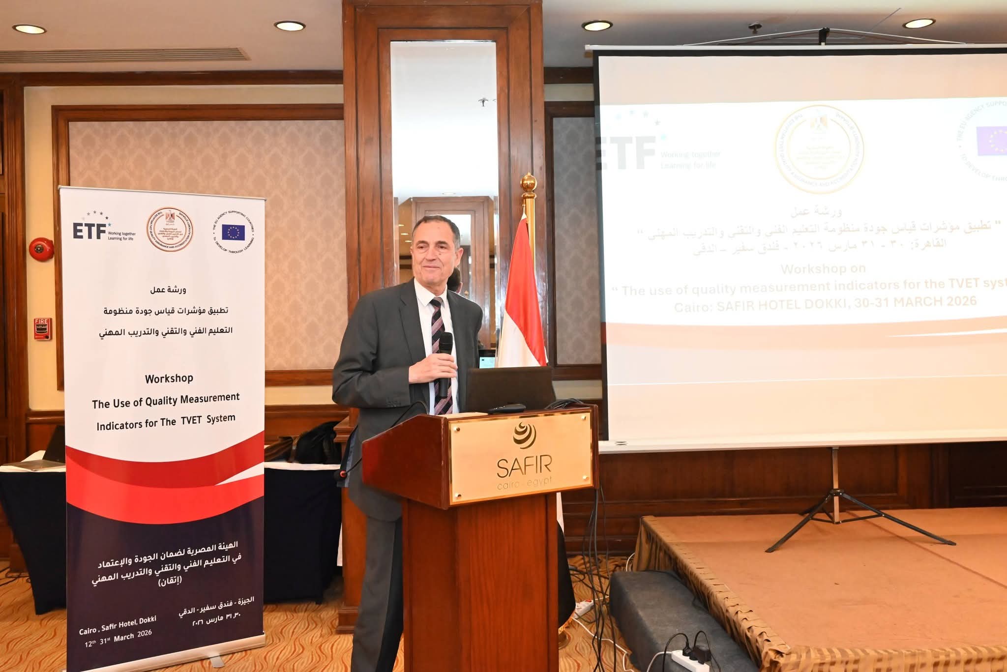 انطلقت اليوم الاثنين الموافق 30 مارس 2026 فعاليات ورشة العمل التي تنظمها الهيئة المصرية لضمان الجودة والاعتماد في التعليم الفني والتقني والتدريب المهني (إتقان)، برئاسة الأستاذ الدكتور/ محمد موسى عماره، بالتعاون مع مؤسسة التدريب الأوروبية (ETF)، بعنوان “تطبيق مؤشرات قياس جودة منظومة التعليم الفني والتقني والتدريب المهني”، وذلك بمشاركة عدد من الخبراء الدوليين من ايطاليا، وهولندا، ومولدوفا، ومقدونيا الشمالية، والمجر، وفلسطين، ومصر، وهيئة فولبرايت، والسفارة الكندية، والبنك الدولى، والوكالة الألمانية للتعاون الدولى GIZ، وممثلي الجهات الوطنية المعنية، وبحضور اللواء أركان حرب مهندس/ محمد حسن العزبى ممثلًا عن وزير الدفاع، والأستاذ الدكتور/ أحمد الجيوشى ممثلًا عن وزير التعليم العالى والبحث العلمى.