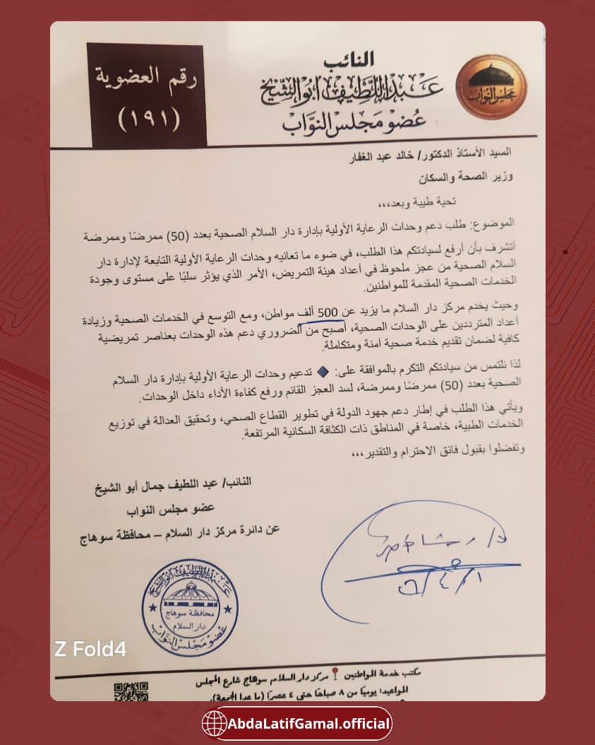 تقدم النائب عبد اللطيف جمال أبو الشيخ، عضو مجلس النواب، بطلب إحاطة بشأن تدعيم وحدات الرعاية الأولية التابعة لإدارة دار السلام الصحية، في ظل ما تعانيه من عجز ملحوظ في أعداد هيئة التمريض، الأمر الذي يؤثر على مستوى وجودة الخدمات الصحية المقدمة للمواطنين.