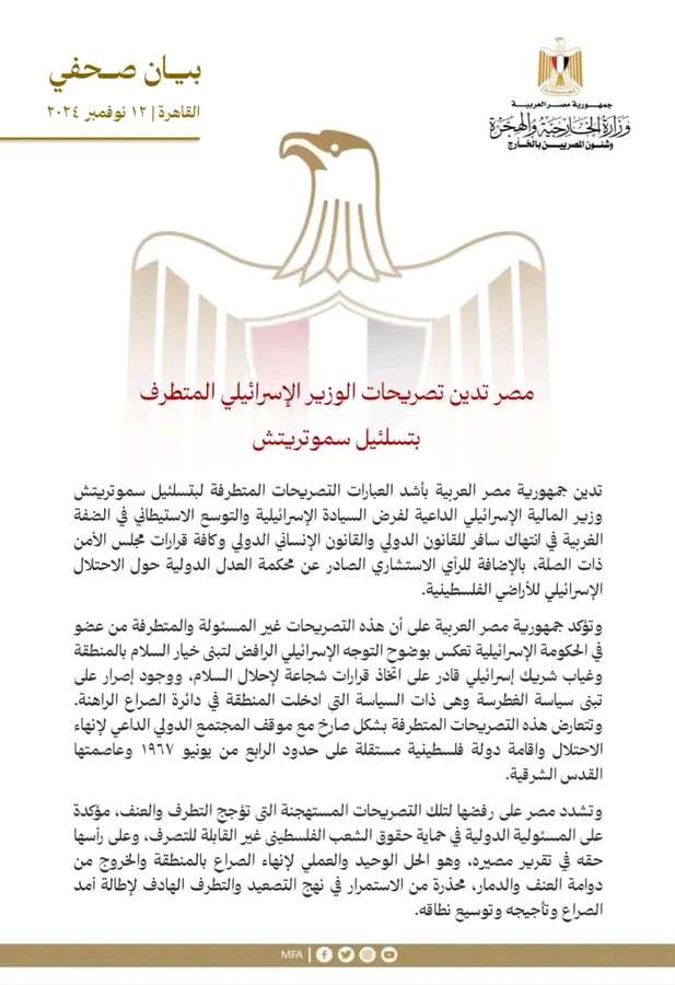 أصدرت وزارة الخارجية المصرية بياناً عبرت فيه عن إدانة جمهورية مصر العربية بأشد العبارات التصريحات المتطرفة لبتسلئيل سموتريتش وزير المالية الإسرائيلي الداعية لفرض السيادة الإسرائيلية والتوسع الاستيطاني في الضفة الغربية في انتهاك سافر للقانون الدولي والقانون الإنساني الدولي وكافة قرارات مجلس الأمن ذات الصلة، بالإضافة للرأي الاستشاري الصادر عن محكمة العدل الدولية حول الاحتلال الإسرائيلي للأراضي الفلسطينية.