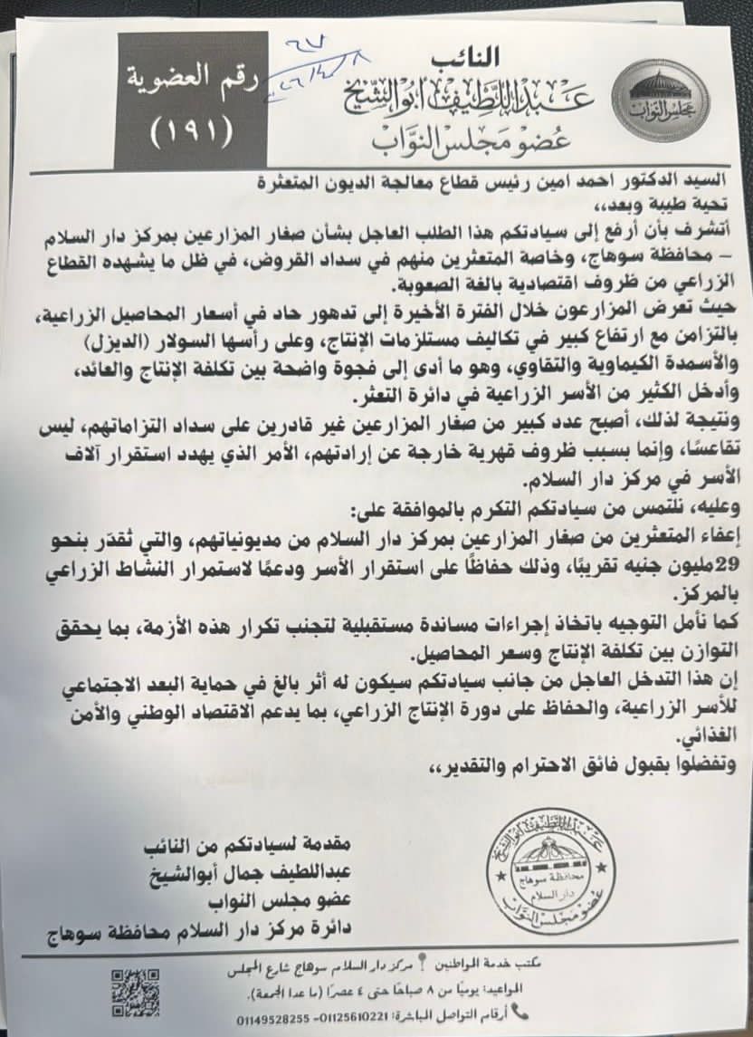 تقدّم النائب عبد اللطيف أبو الشيخ، عضو مجلس النواب، بطلب إلى الدكتور أحمد أمين، رئيس قطاع معالجة الديون المتعثرة، بشأن أوضاع صغار المزارعين بمركز دار السلام بمحافظة سوهاج، وخاصة المتعثرين منهم في سداد القروض، في ظل ما يشهده القطاع الزراعي من ظروف اقتصادية بالغة الصعوبة.