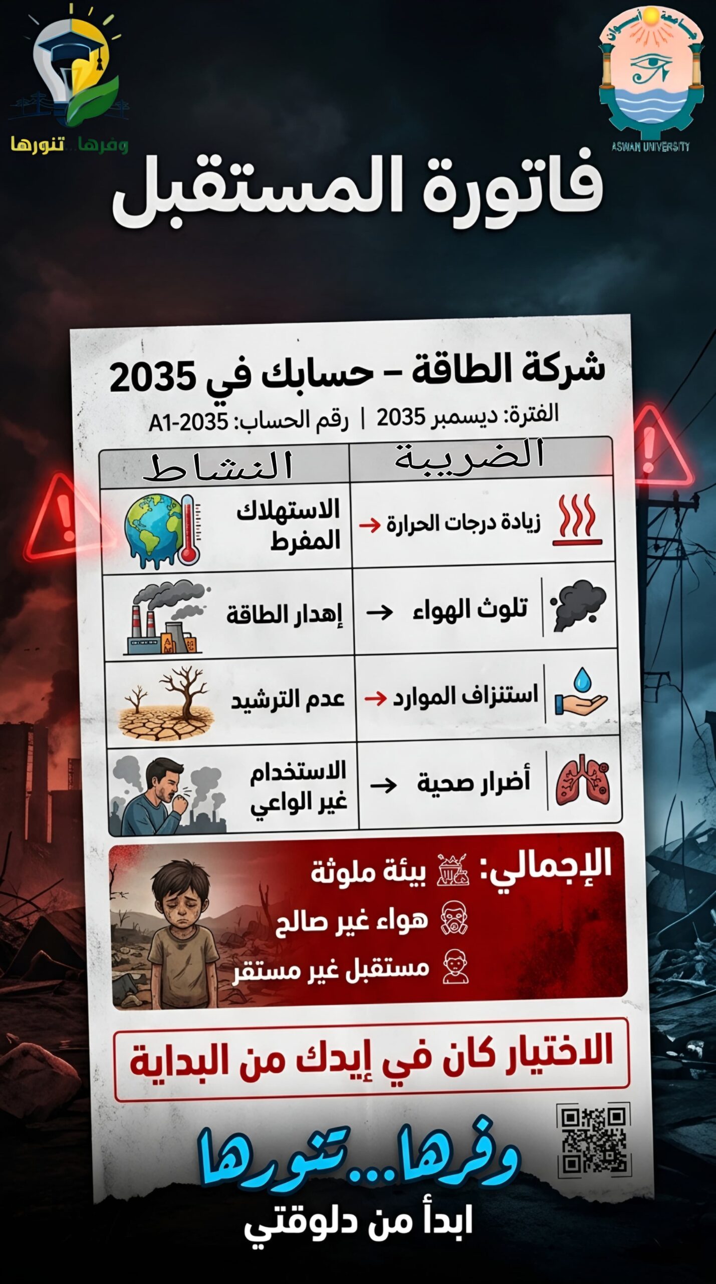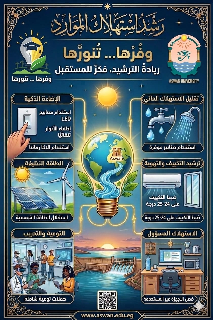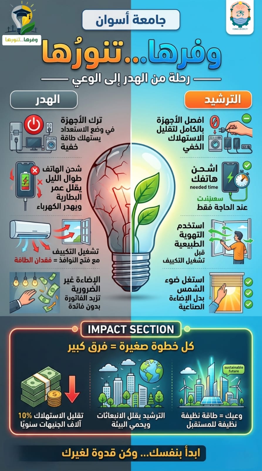 في إطار المبادرة التي أطلقتها وزارة التعليم العالي والبحث العلمي تحت شعار “وفرها تنورها” أعلنت جامعة أسوان عن تنفيذ حزمة متكاملة من المبادرات والأنشطة التوعوية التي تستهدف تعزيز ثقافة ترشيد استهلاك الطاقة ونشر الوعي البيئي بين طلابها بمختلف الكليات.