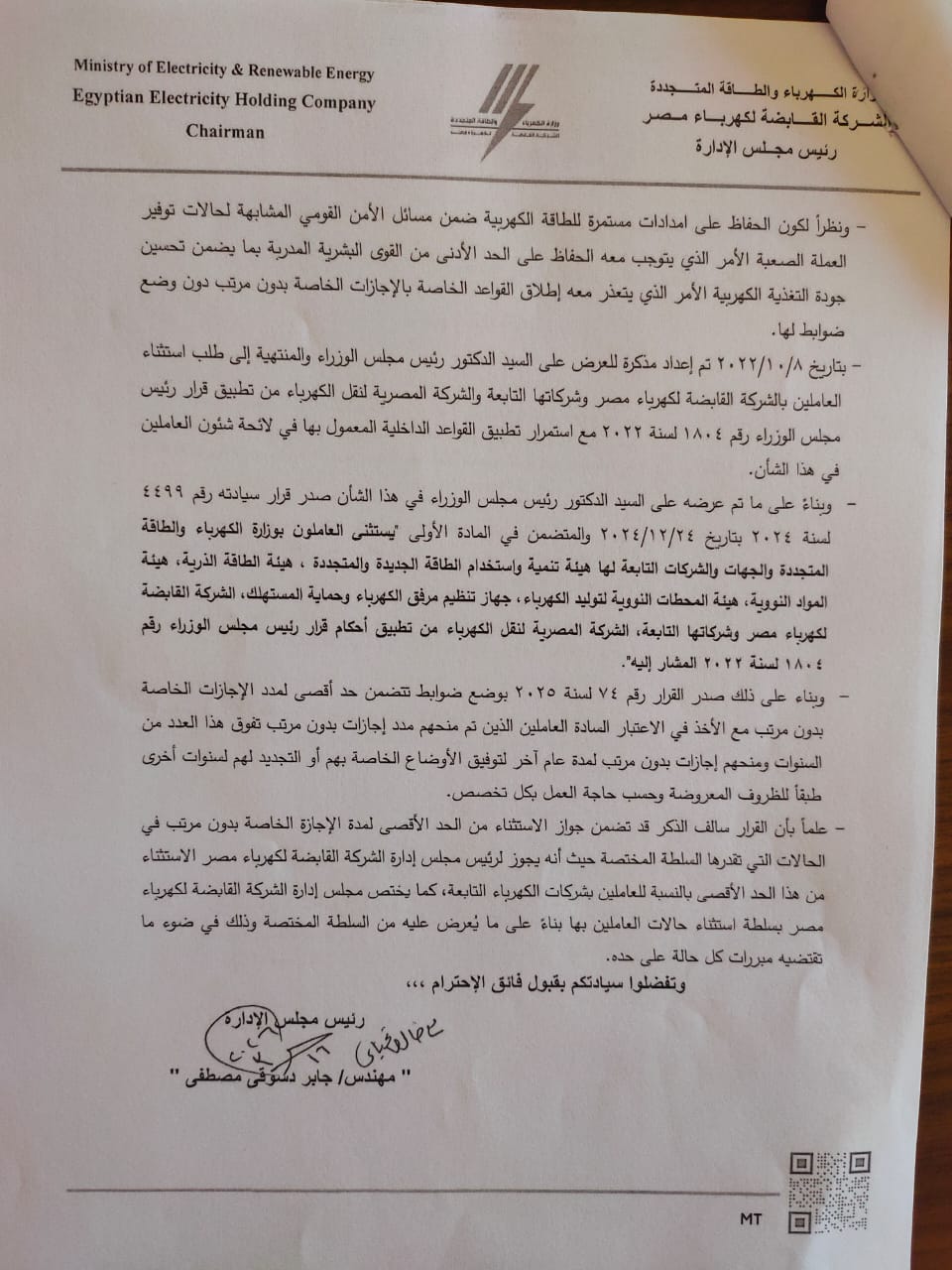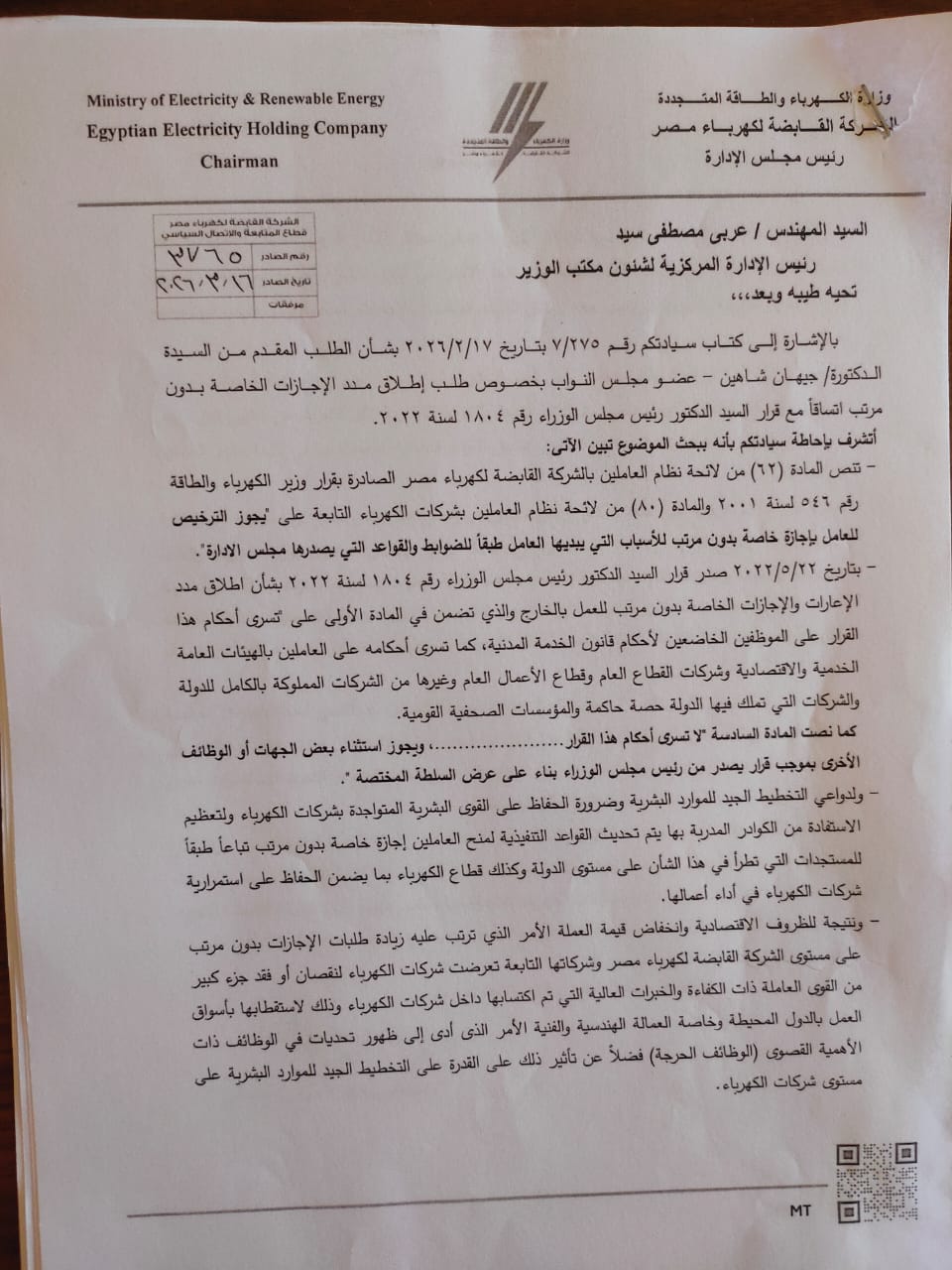 وأكدت النائبة أن وزارة الكهرباء، بالتنسيق مع الشركة القابضة لكهرباء مصر، قامت بدراسة الطلب بشكل عاجل، وانتهت إلى اتخاذ إجراءات من شأنها معالجة الآثار السلبية للقرارات السابقة، بما يحقق التوازن بين مصلحة العمل والحفاظ على الكوادر البشرية المدربة، مع مراعاة الأبعاد الاجتماعية والاقتصادية للعاملين.