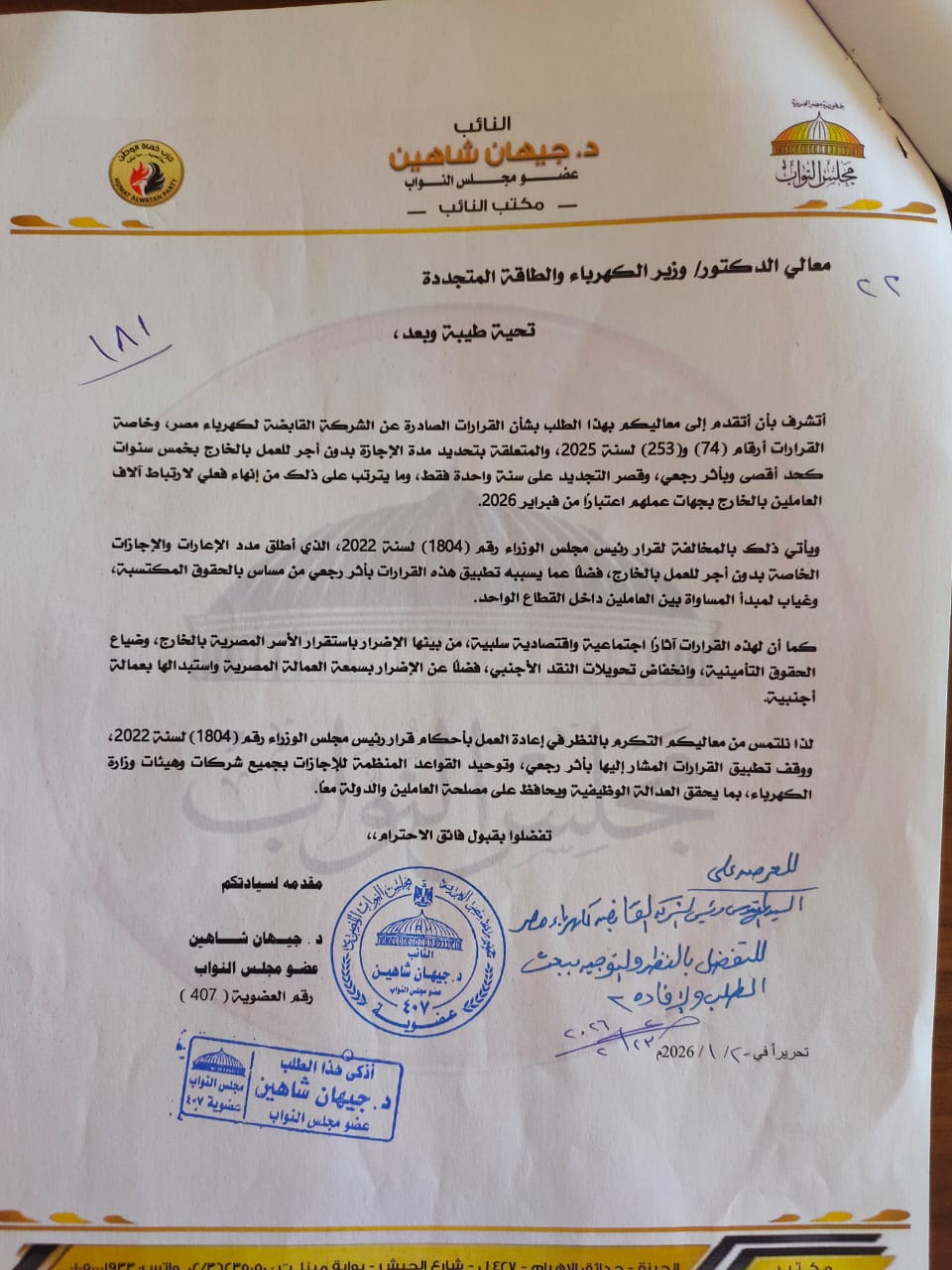 في إطار الدور الرقابي والتشريعي الفاعل، وحرصًا على حماية حقوق العاملين وتحقيق الاستقرار الوظيفي، أعلنت النائبة الدكتورة جيهان شاهين، عضو مجلس النواب، عن الاستجابة الفورية لطلبها المقدم إلى معالي الدكتور وزير الكهرباء والطاقة المتجددة، بشأن أزمة العاملين بشركات الكهرباء المتعلقة بمدد الإجازات الخاصة بدون أجر للعمل بالخارج.