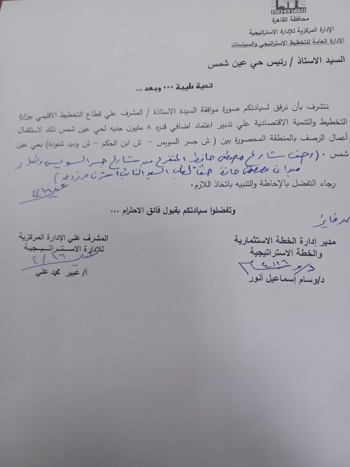 وأكد “مرزوق”، أن هذا الاعتماد جاء لاستكمال أعمال الرصف والتطوير بالمنطقة الحيوية الممتدة بين شارع جسر السويس وشارع ابن الحكم وشارع وديد شنودة، بما يسهم في تحسين البنية التحتية وتسهيل حركة المواطنين داخل الحي، لافتا إلى أن تطوير شبكة الطرق بدائرة عين شمس تستهدف القضاء على مشكلات التكدس المروري ورفع كفاءة الشوارع الرئيسية، بما ينعكس إيجابًا على الحياة اليومية للمواطنين.