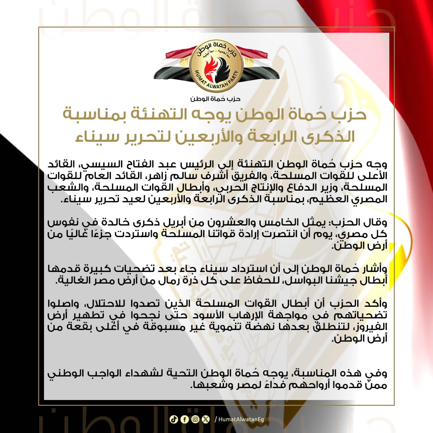 وقال الحزب: يمثل الخامس والعشرون من أبريل ذكرى خالدة في نفوس كل مصري، يوم أن انتصرت إرادة قواتنا المسلحة واستردت جزءًا غاليًا من أرض الوطن.