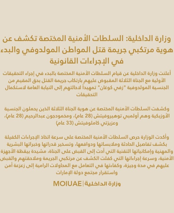 وكشفت الداخلية أن الجناة الثلاثة هم من الجنسية الأوزبكية وذكرت أسماءهم وأعمارهم كما يلي: “أولمبي توهيروفيتش (28) عاما، ومحمود جون عبدالرحيم (28) عاما، وعزيزتي كاملوفيتش (33) عاما”، حسبما نقلت وكالة أنباء الإمارات الرسمية، الاثنين.