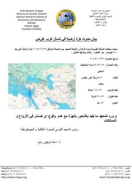 أعلن الدكتور طه رابح، رئيس المعهد القومي للبحوث الفلكية، أن شبكة الزلازل التابعة للمعهد سجلت هزة أرضية، اليوم الجمعة، شمال مدينة قبرص في تمام الساعة 9:13 مساءً.