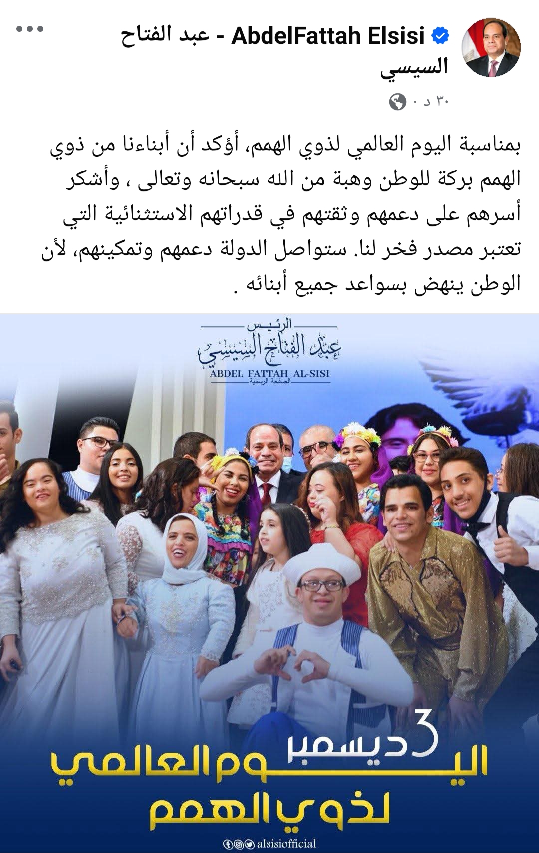 هنأ الرئيس عبدالفتاح السيسي، ذوي الهمم، بمناسبة اليوم العالمي لذوي الهمم، قائلا في منشور له عبر صفحته الرسمية على موقع التواصل الاجتماعي “فيسبوك”: “بمناسبة اليوم العالمي لذوي الهمم، أؤكد أن أبناءنا من ذوي الهمم بركة للوطن وهبة من الله سبحانه وتعالى، وأشكر أسرهم على دعمهم وثقتهم في قدراتهم الاستثنائية التي تعتبر مصدر فخر لنا”.