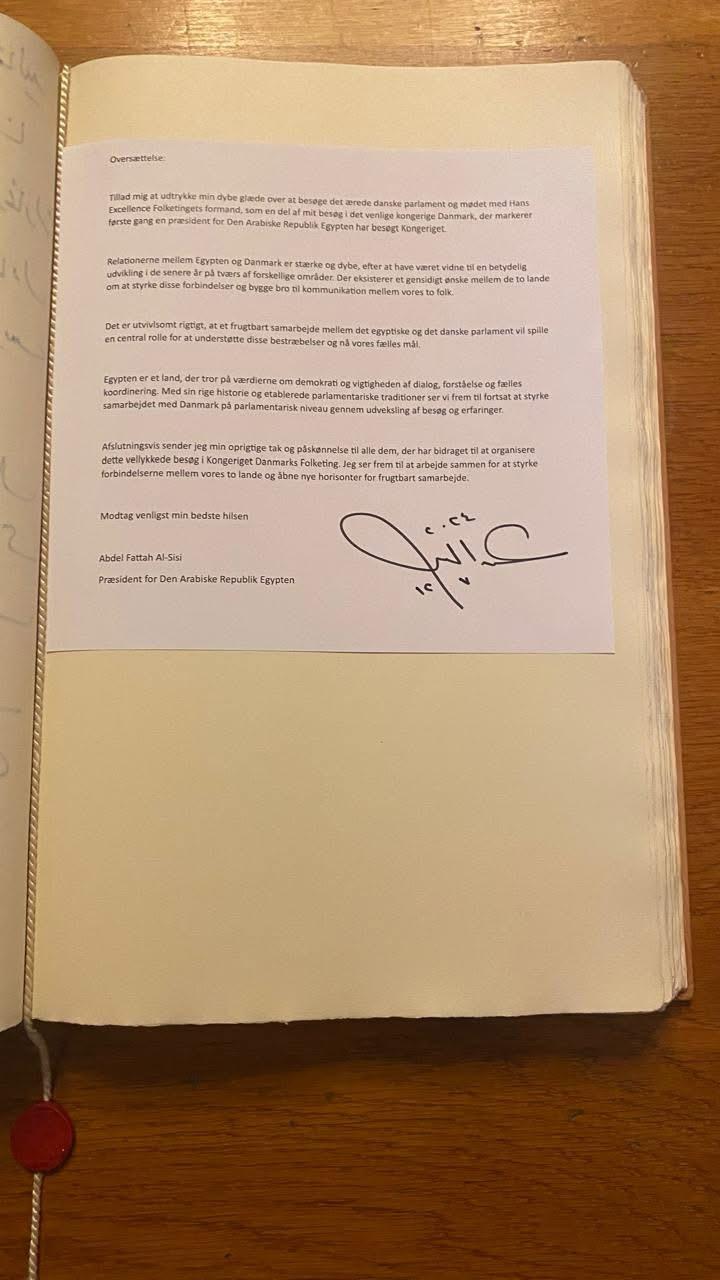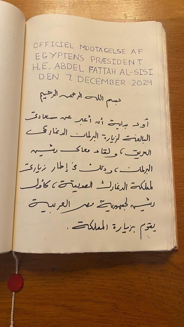 زار الرئيس عبد الفتاح السيسي، صباح اليوم السبت، مقر البرلمان الدنماركي والتقي رئيس البرلمان الدنماركي، ثم وقع كلمة في سجل كبار الزوار بالبرلمان الدنماركي.